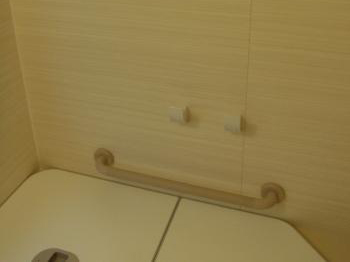 | 使い勝手を考えながら付けたアクセサリー類です。 | 浴槽横に手摺とふたフックを取りつけています。 |